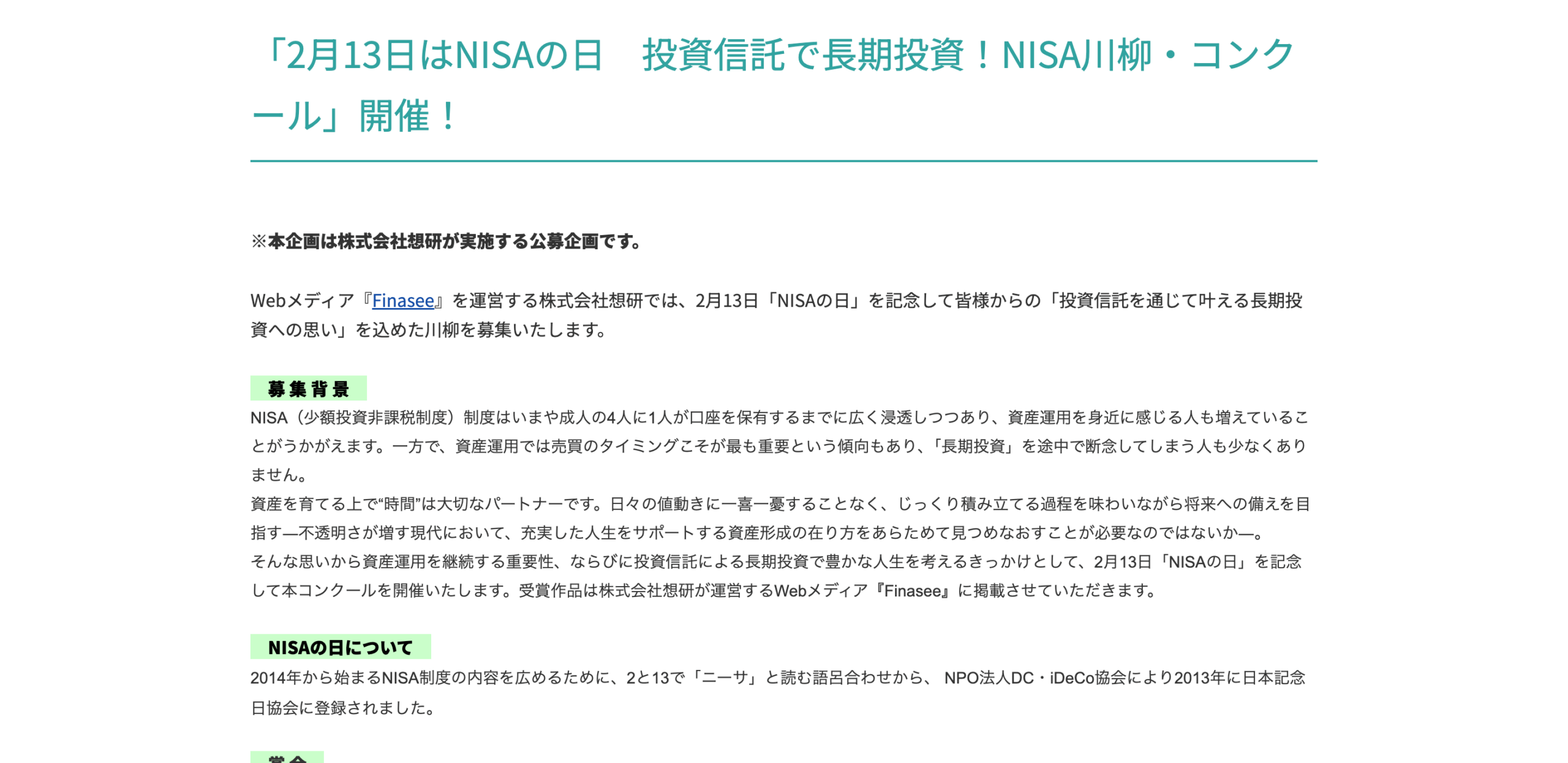 2月13日はNISAの日 投資信託で長期投資!NISA川柳・コンクール【2026年1月4日締切】