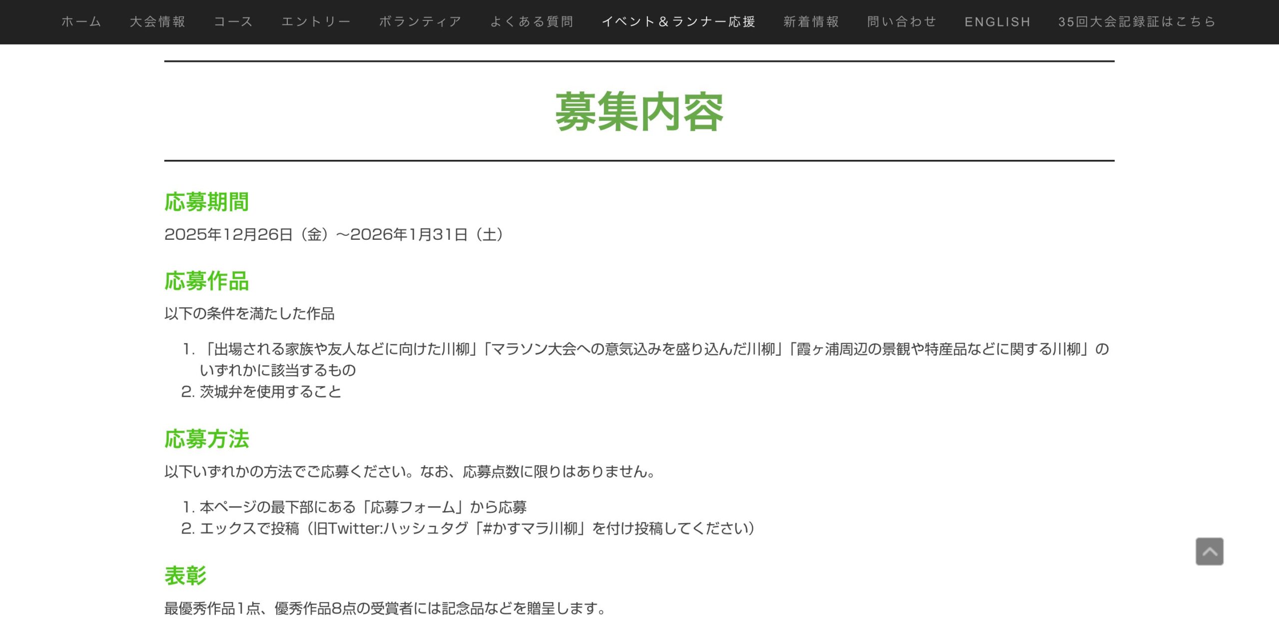- 「出場される家族や友人などに向けた川柳」「マラソン大会への意気込みを盛り込んだ川柳」「霞ヶ浦周辺の景観や特産品などに関する川柳」のいずれかに該当するもの