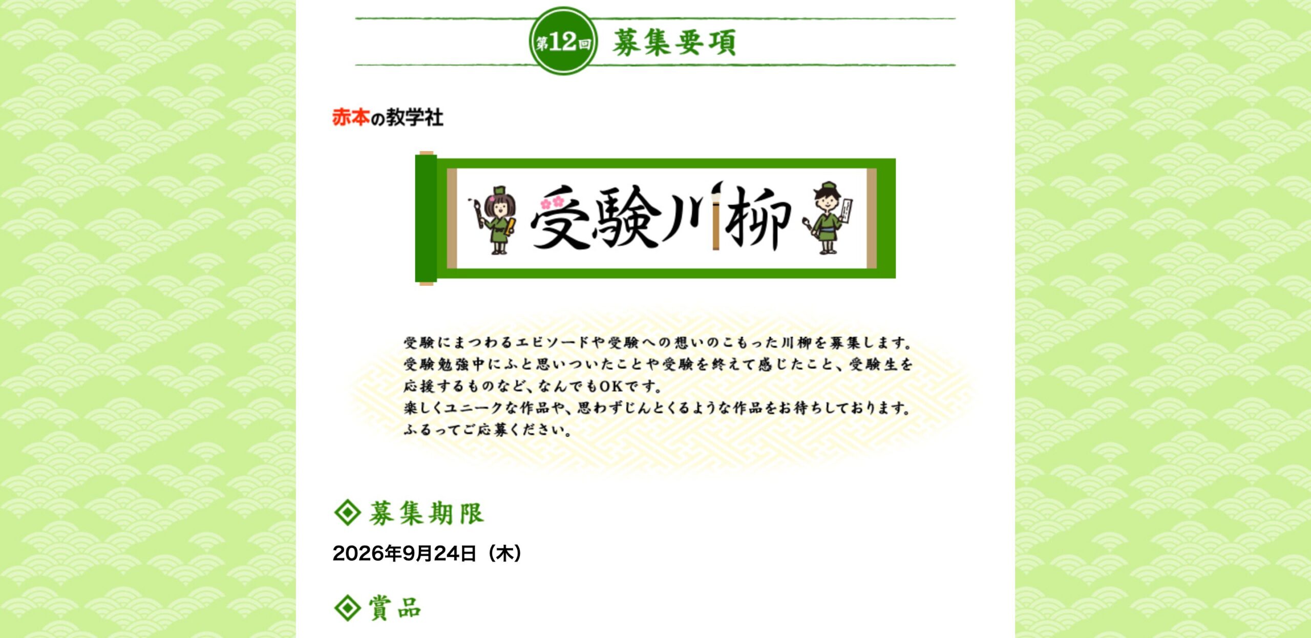 「受験」にちなんだ川柳(五・七・五)。受験勉強の日常、試験当日のエピソード、合格への決意、応援する家族の心境など。作品の説明(状況・心情)を添えて応募。