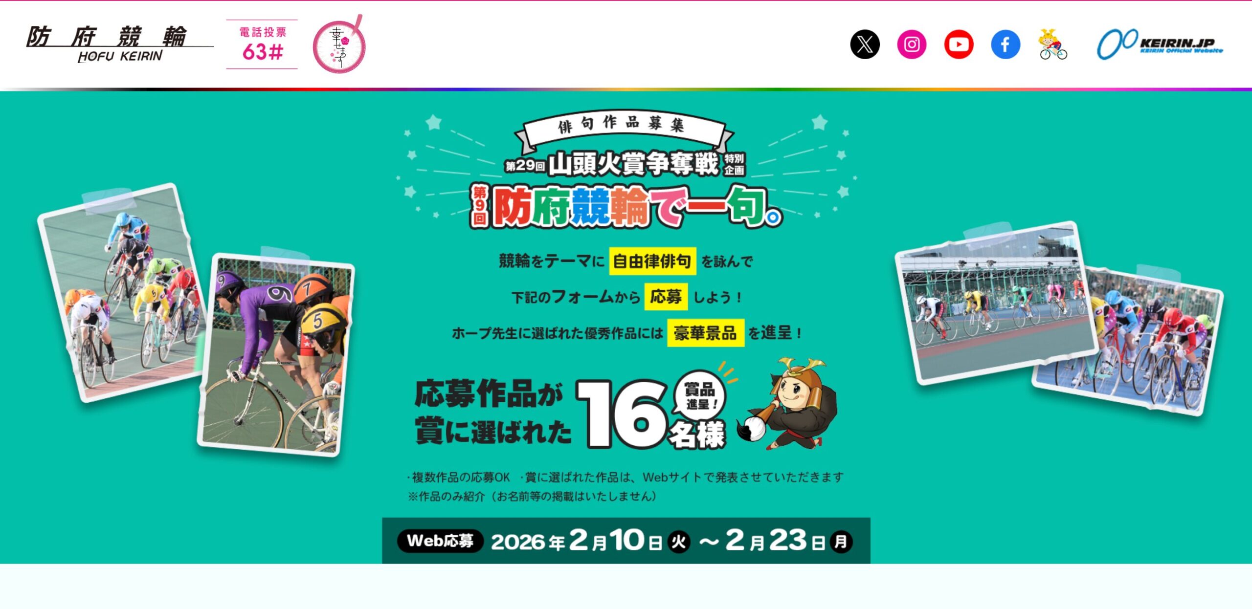 競輪をテーマにした自由な形式の俳句。WEB、または防府競輪場での投函(2/21〜2/23)にて受付。